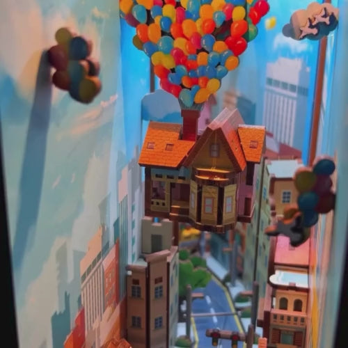 Une maison colorée s’envole dans le ciel, portée par une nuée de ballons multicolores, tandis qu’en contrebas, une ville animée s’étend à perte de vue. Chaque détail — les feux tricolores, les façades colorées, les petites voitures — évoque une scène de film pleine d’émotion et de douceur.